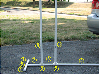 I haven't included standard measurements for each piece since every dog height is a bit different so you can make yours to scale. I have included the approximate measurements in parenthesis for the pieces I use, just adjust accordingly. Also know that your slip joints will eat 1/2 of an inch off any pipe pieces you use.
